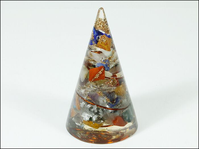 中に敷き詰められたミックスストーンチップは有機物が固まる際にかかる圧力により生じる電圧(ピエゾエレクトリック効果)で天然石特有のオルゴンエネルギーを常時発生させる為のものとされています。